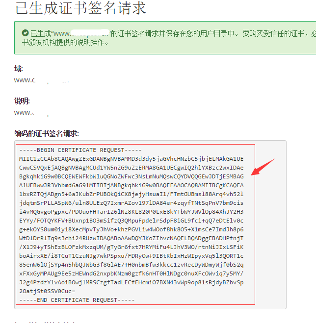 5. 这个时候你将得到一对CSR和KEY,请注意通过这个CSR申请的证书只能和这个key配对使用,如果你的这个key丢失了,这个CSR所申请的证书将无法使用。